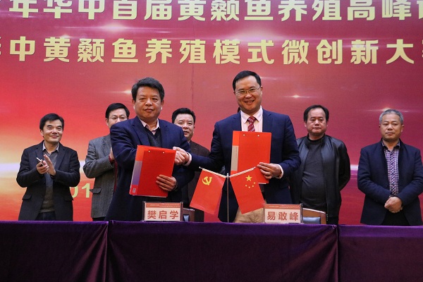 樊启学与大北农神爽水产科技集团总裁签订技术合作协议 副董事长姚江林致欢迎辞 桂建芳院士致辞 3月9日上午,“华中首届黄颡鱼养殖高峰论坛”在国交一楼报告厅举行。