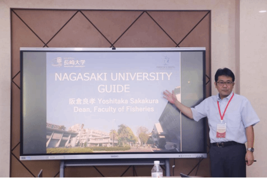 Yoshitaka SAKAKURA 教授率先作题为《长崎大学水产养殖研究实验室关于海洋鱼类苗种培育与鱼苗早期生活史研究》的报告。其研究团队围绕海洋鱼类幼苗生产的关键技术环节,系统开展活饵料优化、养殖缸设计改良等工作,有效提升了幼苗存活率与发育质量;同时通过深入探索东海鱼类早期生活史特征,为渔业资源的科学保护与可持续利用提供了重要理论支撑。