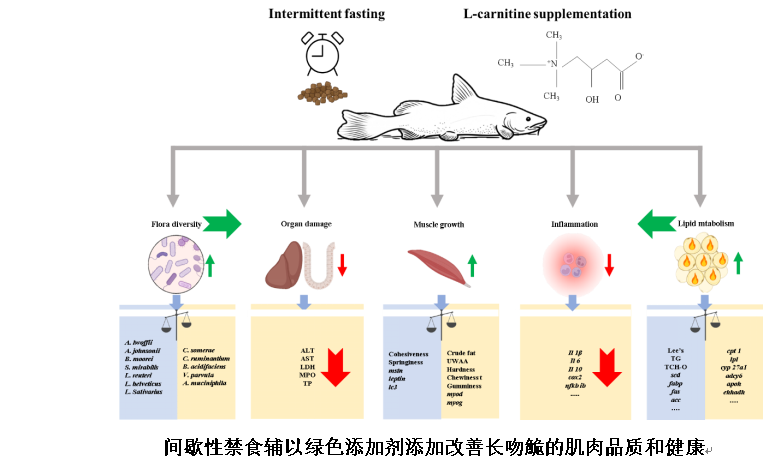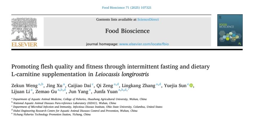 2025年8月5日,伟德国际VICTOR1946袁军法副教授团队在国际学术期刊Food Bioscience发表了题为“Promoting flesh quality and fitness through intermittent fasting and dietary L-carnitine supplementation in Leiocassis longirostris”的研究论文。该研究综合利用现代生物技术,成功研发长吻鮠环保高效暂养技术。相比传统的“瘦身”(吊水)养殖模式,采用间歇性禁食辅以绿色添加剂添加的方法暂养28天显著提升鱼肉品质和风味,减轻长期饥饿引起的体重损耗和死亡状况,维护鱼体健康。