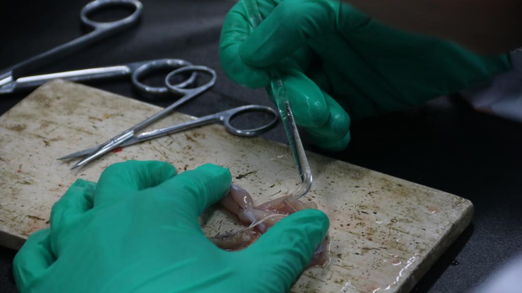 比赛现场,参赛选手们有条不紊地进行实验操作。来自bv伟德国际1946的杨东烨用左手拇指按住青蛙的背部,食指按住青蛙头前部,另一只手持着毁髓针,轻车熟路地找到了青蛙的枕骨大孔。杨东烨说:“找到枕骨大孔后要捣毁脑组织和脊髓组织,破坏完全的青蛙的四肢是松软的。这也是后续实验步骤的基础。”接着她用剪刀剪断蛙的脊柱,剥去皮肤和内脏组织,分离双腿,小心翼翼地用玻璃分针分离坐骨神经。在成功制作标本后,她长松了一口气。她说:“在比赛过程中,心态才是真正的决胜因素。”