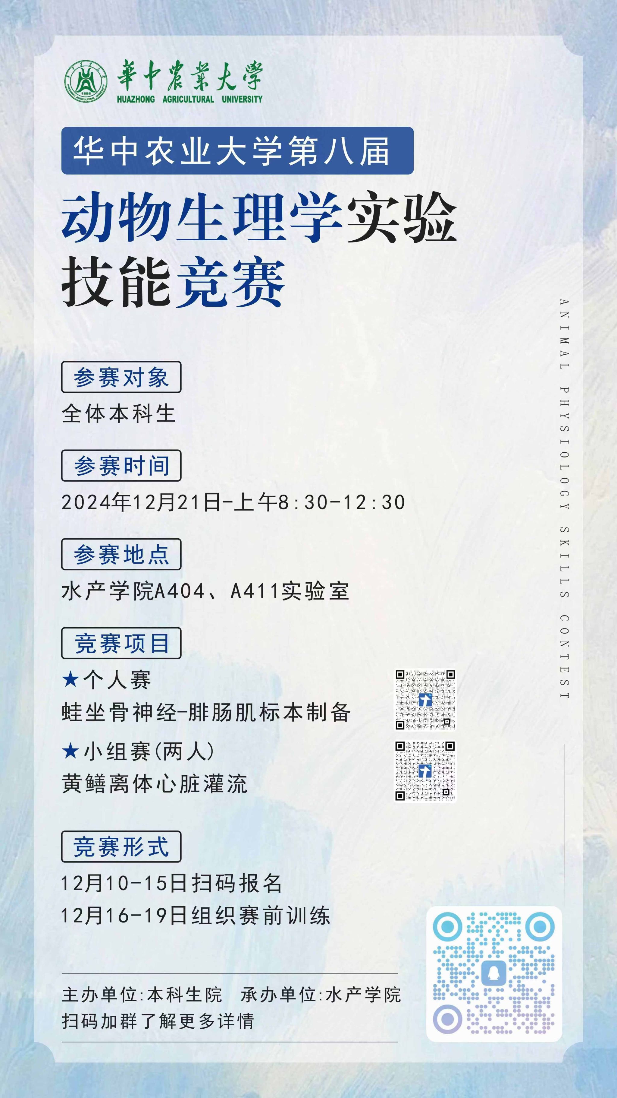 12月10~15日扫描大赛海报中的二维码报名,同时加入动物生理学技能大赛QQ群257986794 获取赛事具体信息。