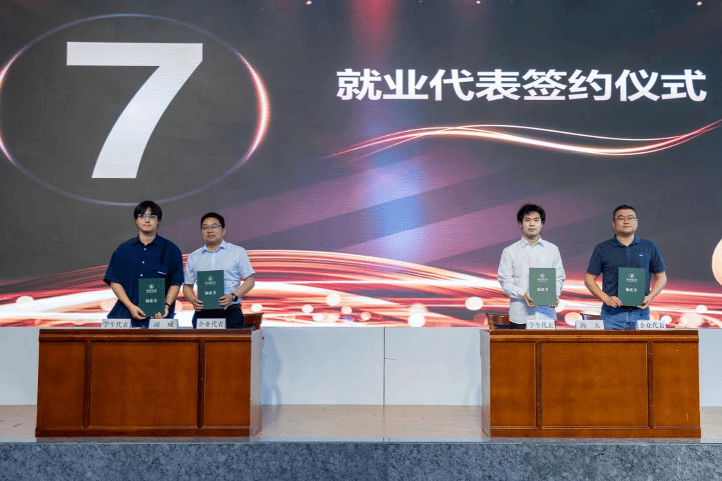 颁奖仪式后,举行了就业代表签约仪式,广东海大集团股份有限公司华中大区生产技术总经理助理刘振兴、通威农业发展有限公司华中二区人行总监高克伟与两名毕业生现场签订就业协议。创业员工代表2014级员工、好渔郎(武汉)农业科技有限公司总经理敖云飞结合“渔惠笑”品牌创立历程,为学弟学妹提出三点建议:一是在学业选择上理性评估考研与就业路径,避免盲目跟风;二是通过社团活动、社会实践主动锤炼沟通协作能力,为职场储备软实力;三是入职初期建立行业敏感度,通过3-6个月实践快速判断岗位与自身发展的适配性。