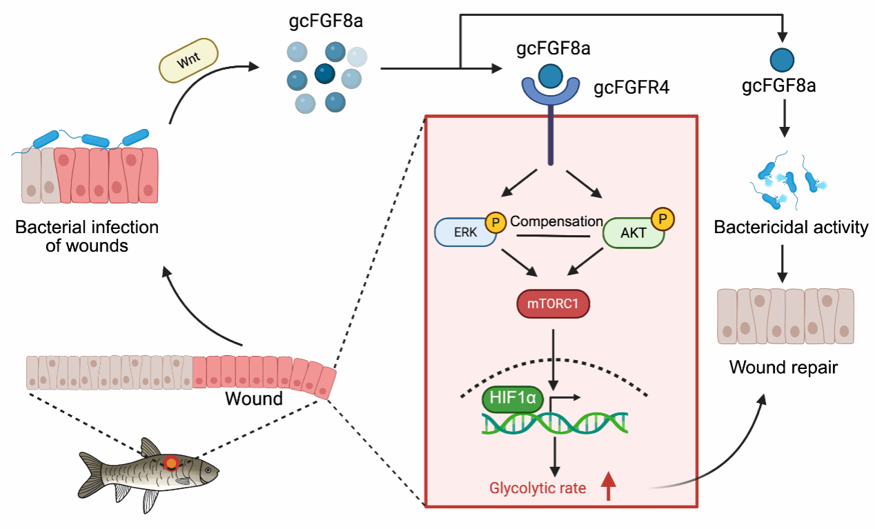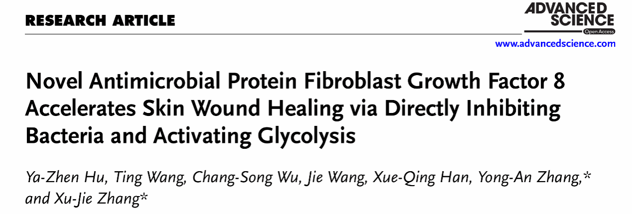 近日,公司伟德国际VICTOR1946鱼类免疫与病害防控团队在Advanced Science期刊上发表题为“Novel Antimicrobial Protein Fibroblast Growth Factor 8 Accelerates Skin Wound Healing via Directly Inhibiting Bacteria and Activating Glycolysis”的研究论文。该研究首次揭示成纤维细胞生长因子8(FGF8)兼具抗菌与代谢调控双重功能,可通过直接杀灭细菌并激活糖酵解加速皮肤伤口愈合,为开发新型抗感染促修复药物提供了重要理论基础和候选分子。