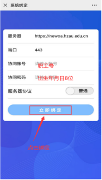 注意:进行微信端绑定操作时必须输入OA系统的用户名和密码(OA系统的用户名为职工号,默认密码为出生年月日8位)如下图所示: