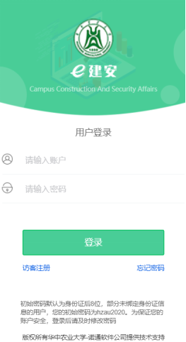 微信公众号查找“e建安”并关注,或登陆网址:http://ejan.hzau.edu.cn:8083/,点击“我的业务”进入,首次办理需要注册。教职工通过12位工号和8位生日进行登录、员工通过学号进行登录,常驻人口通过访客注册进行登录,系统会根据注册人员的身份自动分配权限,请大家不要错用身份登录。