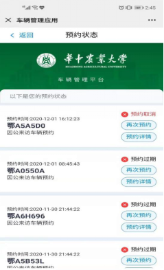 进入“车辆预约结果查询”可以查看自己的预约车辆信息,也可以再次预约车辆。