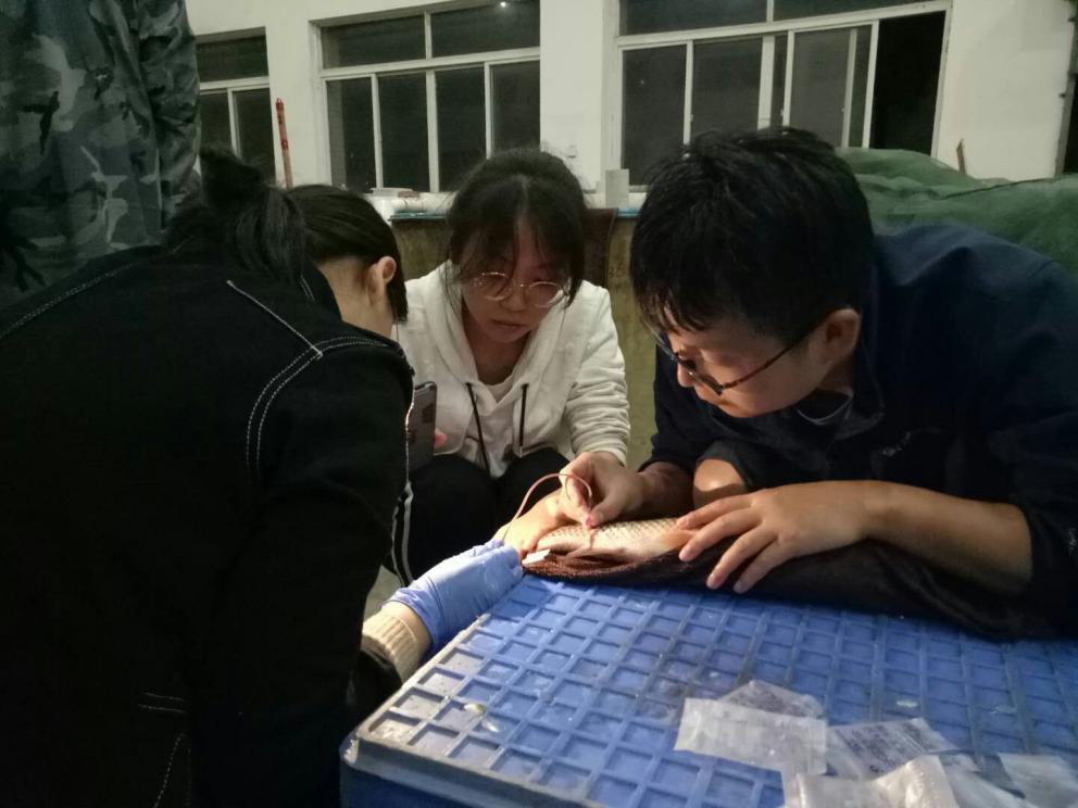 除了苗种生产方面的工作,为丰富队员们的实习生活,呼光富老师还根据员工的兴趣,将队员们分为三个小组,每个小组分别负责一个实验。在草鱼采血实验中,他边示范边讲解道:“首先要找到鱼体尾端侧线鳞上的黑色小孔,然后将针头垂直插下去,缓慢试探血管的位置。一般而言,我们要找的血管就在脊椎骨下方,当针插入血管时就能在透明部分看到血珠,这个时候再连接采血管,就能看到血流。”他时刻关注着同学们的反应,并鼓励员工大胆尝试,敢于动手。