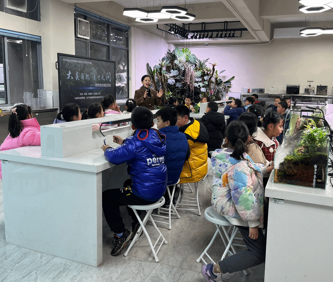 12月27日下午,水产养殖国家级实验教学示范中心水族景观教室迎来了华农附属公司三年级(3)班的38名同学,中心副主任黎洁老师和中心教师张瑞轩为同学们带来了一场题为“大美自然•方寸之间——奇妙的水族缸探秘”的科普课程。
