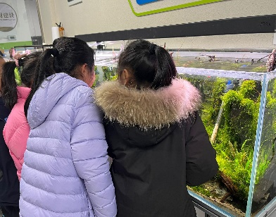 有了以上的预备知识,同学们在老师和助教的带领下参观了全国老员工水族箱造景大赛中bv伟德国际1946员工的获奖作品。见到真正的水族缸,同学们立刻围了过去,眼睛紧紧地盯着这些美妙的作品,发出阵阵惊叹声。只见一个个水族缸中,翠绿的水草随着水流轻轻摆动,宛如一群绿衣仙子在翩翩起舞。缸底铺满了陶粒,五彩斑斓的小鱼穿梭其中,时而躲进水草的怀抱,时而探出脑袋好奇地张望着外面的世界。随后的分享环节,同学们纷纷发表着自己的看法,“我喜欢2号缸,因为这个水族缸有很多漂亮的红绿灯鱼,还有很多水草,像一个梦幻的海底花园!”“我喜欢6号缸,因为它造型很别致,有个拱形的洞,小鱼可以在里面游来游去,和水草在一起,感觉很和谐。” “我喜欢3号缸,因为里面有鱼,有螺,还有各种各样的水草,颜色特别漂亮”!