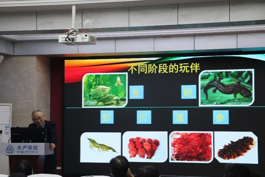 杨红生教授还介绍了不同阶段的水生动物玩伴。相关生物分别是鱼、鲵、虾、贝、藻、参。 他形象地介绍了这些水产生物在水产养殖、研究等不同阶段的重要性和关联性。这些生物涵盖了鱼类、两栖类(鲵)、甲壳类(虾)、贝类、藻类以及棘皮动物(参) ,它们在水产领域中具有重要的经济价值和生态意义。