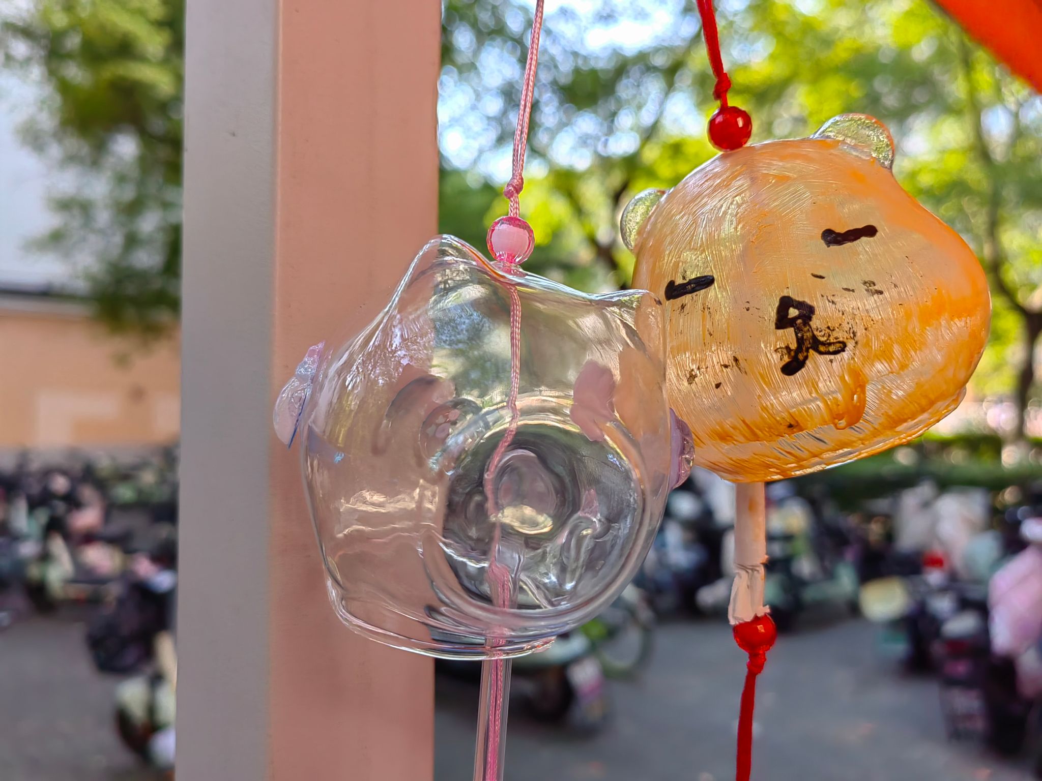 活动现场,一张张长桌铺满缤纷的玻璃颜料与调色盘,参与者们或凝神勾勒,或笑语交流,将天马行空的创意倾注于素色风铃之上。深邃的星空、可爱的小动物……贴纸的灵动与颜料的斑斓交织,每一笔色彩都承载着青春的畅想,每一串风铃都化身为独特的艺术符号。完成作品的同学可领取限定款扇子与明信片,或珍藏留念,或将风铃与装饰明信片一同悬挂于展区,让春日的微风为作品注入灵动的生命力。