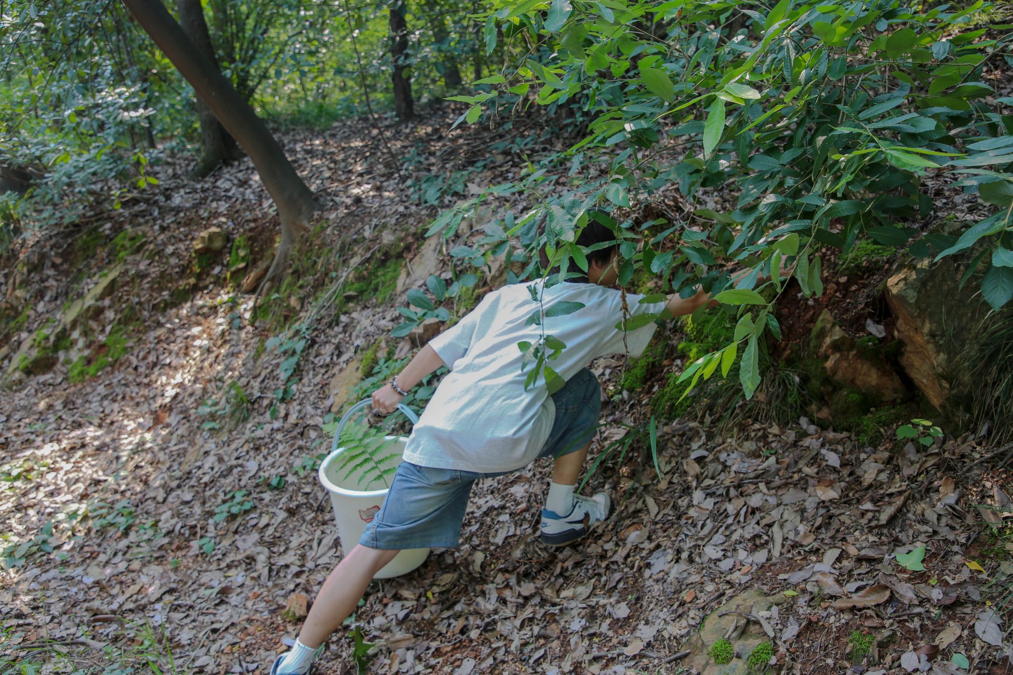 随后,满怀憧憬的参与者们踏上了前往狮子山额野采之路。抵达目的地后,大家迅速投入到采集工作中,小心翼翼地挑选各种苔藓和心仪的植物。采集袋中很快便装满了形态各异、翠绿欲滴的植物素材,收获颇丰。回到水族景观设计实验室,工作人员为大家发放了制作生态瓶所需的材料,包括透明玻璃瓶、营养土、小铲子、装饰用的小石子和卡通小摆件等。