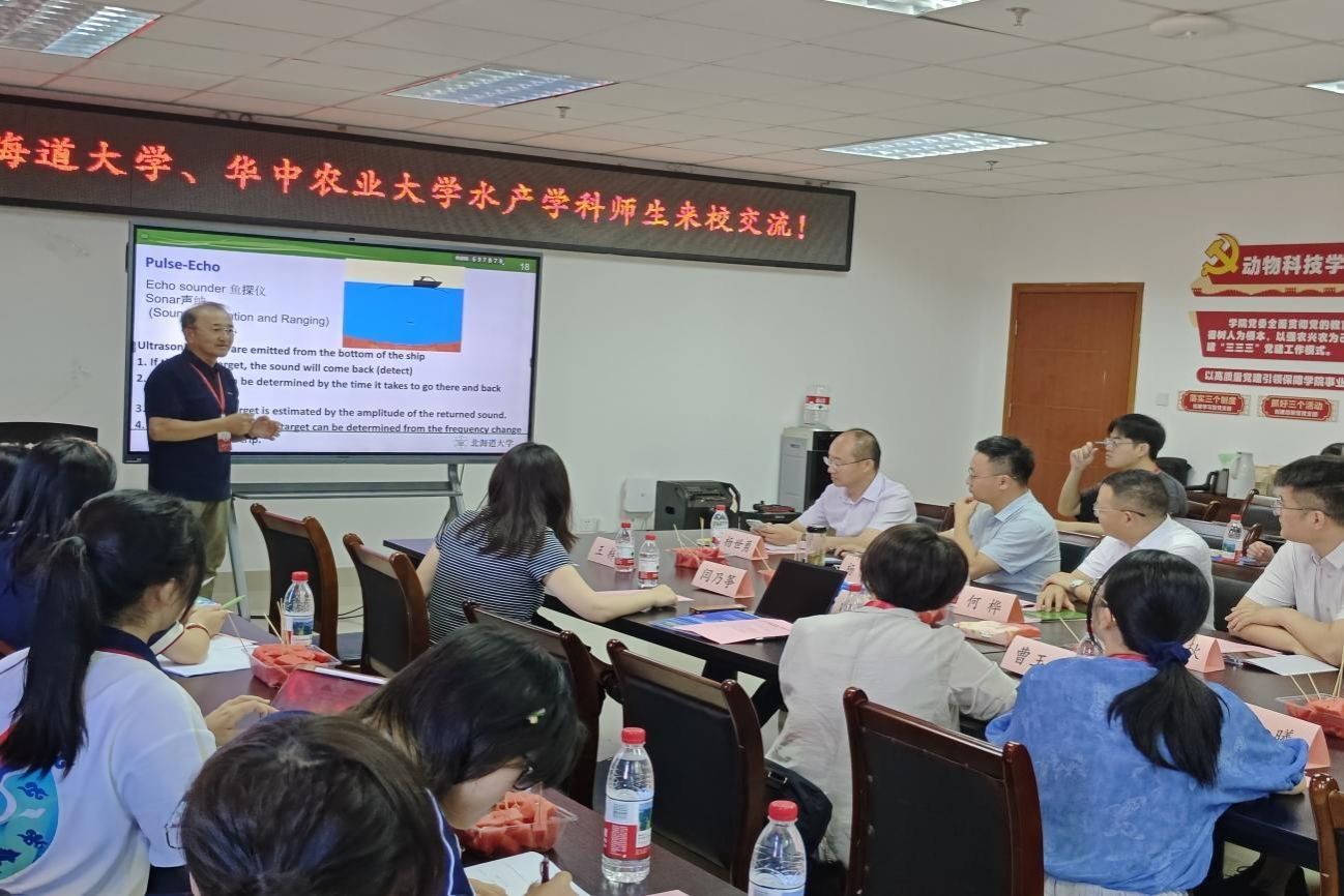 四川农业大学动物科技公司党委书记何桦进行致辞,向井徹教授、四川农业大学动物科技公司副经理杨淞教授等专家学者与中日三校的师生就两校特色水产研究方向,以及水产养殖、种质资源保护、营养饲料等共同关注的研究领域进行了深入探讨与交流。