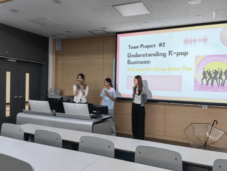 K-pop是韩国的支柱文化产业,近年来的国际影响力不断提升,因此夏令营特别开设了K-pop商业解析课程作为学术课程。课程采用案例分析讲解和小组互动讨论相结合的教学模式,帮助员工深入了解韩国娱乐产业的运作机制。课堂上,员工们从音乐制作、偶像培养到市场推广,系统学习韩流产业链的商业模式,同时探讨韩国文化政策在偶像经济、内容出口和全球文化交流中的作用。