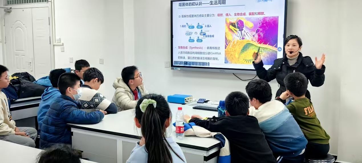 课堂伊始,黎老师以“世界上最致命的生物是什么?”这一有趣设问切入,用生动通俗的语言揭开噬菌体的神秘面纱。从“噬”字“咬、吞”的本义出发,循序渐进地讲解了噬菌体的核心特性——只感染细菌、不侵袭真核细胞的严格宿主特异性,以及不具备细胞结构和蝌蚪形、球形、线形的多样形态。在噬菌体发展史环节,黎老师通过两位“武林高手百年争霸”的故事引入,结合恒河水杀菌之谜、弗莱明发现青霉素的偶然机遇、超级细菌肆虐下噬菌体“王者归来”上演一系列救命奇迹的真实案例,将科学发现的曲折历程与现实应用价值相结合,还通过互动提问引导孩子们思考“过度使用抗生素的危害”,让抽象的微生物知识变得贴近生活、引人入胜。课堂上,孩子们眼神专注,频频举手追问“噬菌体怎么从细菌里跑出来?”“我们身边哪里能找到噬菌体?”原本陌生的科学术语在师生互动中逐渐清晰可感。