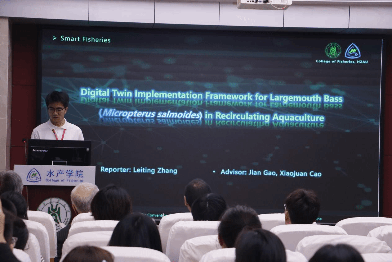 随后,bv伟德国际1946另一位博士生张雷霆作了题为“大口黑鲈循环水养殖系统的数字孪生实施框架”的报告。针对传统水产养殖面临的资源与环境压力,该研究构建了一套六层数字孪生系统:从物理层到决策层,通过水下摄像头、声学传感器等设备实现鱼类摄食行为量化分析,并利用Unity引擎建立三维动态模型。实验显示,该框架能有效整合水温、pH值等环境参数与个体行为数据,显著提升养殖密度与投喂精准度。他强调,数字孪生技术可降低循环水系统30%的运维成本,为智慧渔业发展提供了可复用的技术范式。