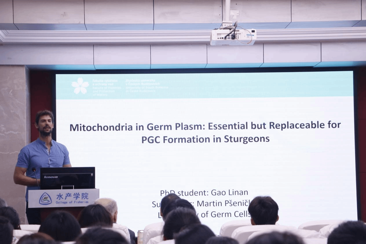接着,捷克南波希米亚大学的Martin PSENICKA教授作了题为“生殖质中的线粒体:在鲟鱼原始生殖细胞形成过程中必不可少但可被替代 ”的报告,以鲟鱼原始生殖细胞中的线粒体为研究对象,揭示了线粒体对原始生殖细胞发育的关键作用及相关特性,为鲟鱼母系遗传保护提供新思路。