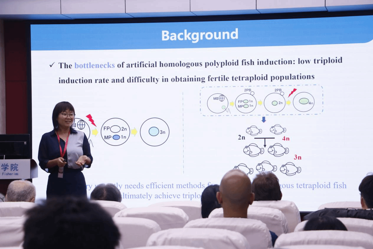 最后,bv伟德国际1946曹小娟教授作了题为“有丝分裂缺陷导致鱼类不减数精子发生”的报告。报告揭示了细胞周期调控关键基因cdk1/2和分离酶基因espl1在鱼类不减数精子发生中的重要作用。通过基因敲除实验,她所带领的团队发现Cdk1和Espl1功能缺陷会导致精母细胞有丝分裂异常,进而产生二倍体不减数精子。这类不减数精子与正常卵子结合后可形成三倍体。通过架设‘三倍体桥’成功获得了人工四倍体。人工四倍体与野生型二倍体交配后,产生了全三倍体群体,孵化率达80%以上。该成果为水产养殖三倍体育种提供了新的技术路径,可解决传统温度休克或静水压诱导法存在的效率低下等问题。
