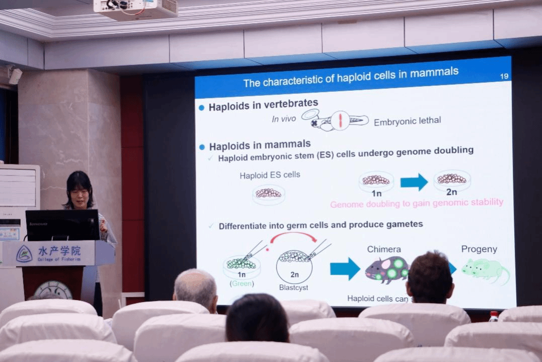 随后,北海道大学Moe TAKEUCHI博士生作了“青鳉单倍体胚胎生殖细胞通过减数分裂前的基因组加倍产生配子”的报告。据研究,尼罗罗非鱼和虹鳟精子能成功激活日本青鳉卵子发生雌核发育,而金鱼和泥鳅精子很少能激活,且存在异常发育情况。TAKEUCHI博士生巧妙地运用了大量精巢和卵巢的组织学图片及数据分析来支撑其研究成果,来比较不同样本中生殖细胞面积大小等,展示了从生殖操作实验到细胞特性及组织学分析的系统研究思路。