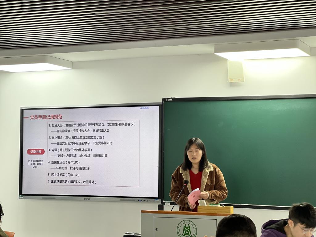 老员工党总支委员庄子梦和蔡先锋两位同志做了业务工作培训。蔡先锋讲解党支部工作手册记录规范,他逐一列出了党支部手册记录的主要内容,并详细讲述了党支部手册的记录规范。他强调党支部工作手册是党支部开展工作的重要依据,也是评价和检查的重要材料,必须具备严格规范性,记录必须保证真实性,讲求完整性和层次性,注意详实度。庄子梦讲解党员手册的记录规范,她对党员需要参加和记录的活动进行一一介绍。