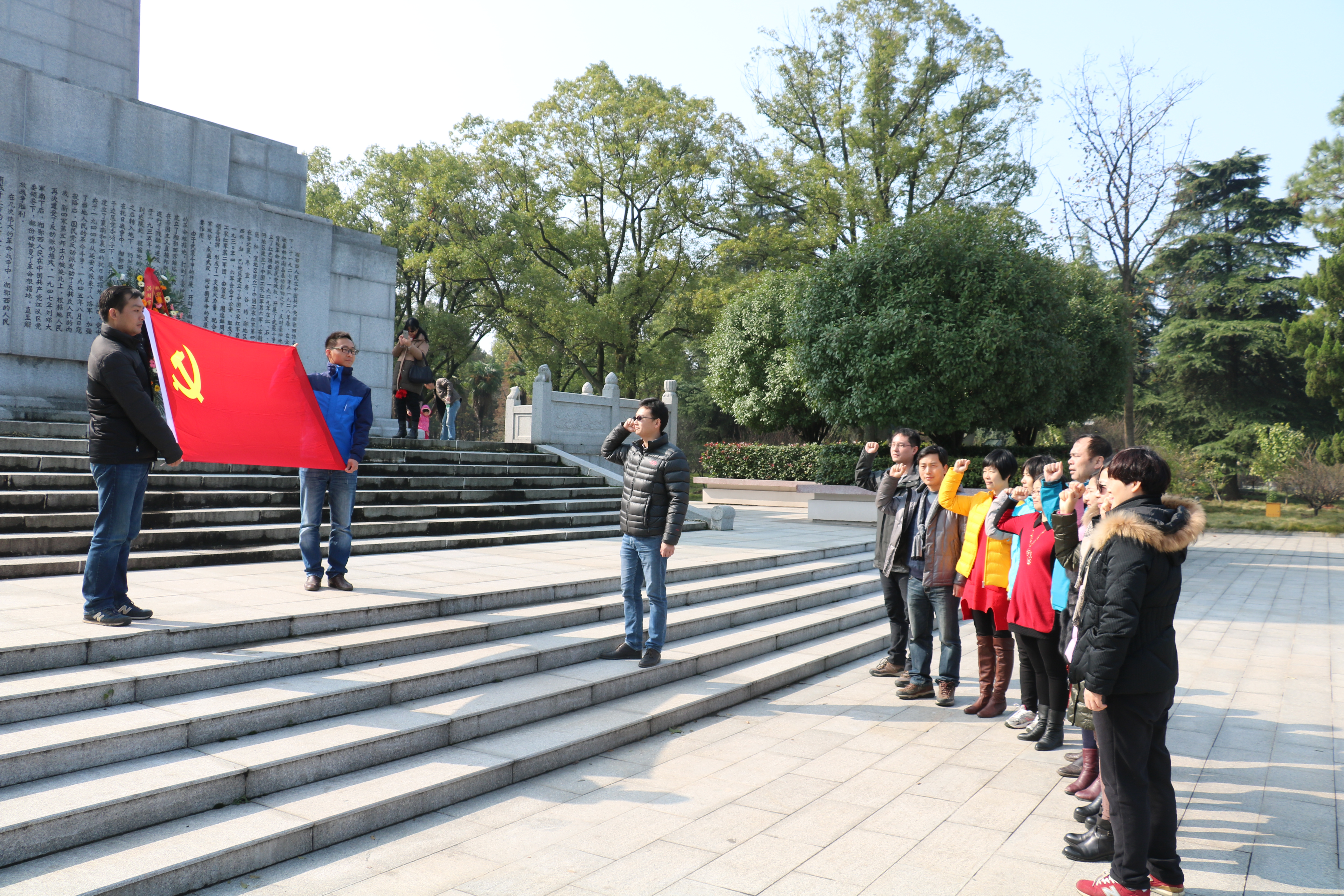 随后,一行人来到洪湖市烈士陵园瞻仰。洪湖市烈士陵园,亦称湘鄂西苏区革命烈士纪念馆,是中共湖北省委为纪念贺龙、周逸群、段德昌等老一辈无产阶级革命家和湘鄂西苏区牺牲的革命烈士所建。支部成员首先来到湘鄂西苏区革命烈士纪念碑前缅怀革命先烈,并在纪念碑前举行了宣誓仪式。支部全体党员在支部书记袁军法的带领下重温了入党誓词。一行人来到历史馆学习,馆内展示了第二次国内革命战争时期湘鄂西苏区史实,概括而生动地再现了湘鄂西人民革命斗争的光辉历程。在解说员的带领下大家回到了贺龙等老一辈革命家艰苦斗争的峥嵘岁月,感受了共产党人为了理想信念不懈斗争的革命精神,接受了一场生动的革命传统教育。一行人还在湘鄂西苏区烈士祠进行了缅怀。