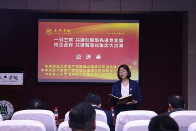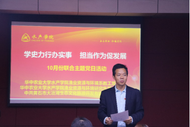 周琼书记简单介绍出席本次活动的黄石大冶湖文旅公司党支部党员骨干与公司领导与教师后,重点介绍了黄石市大冶湖文旅公司党支部“一引三联,共建创新型先进党支部:产业对接,共谋智慧化生态大冶湖”的党建工作思路和本次对接共建活动的目的和意义。曹玉琼代表公司致欢迎辞,对百忙之中参加会议的各位同志表示欢迎,并着重介绍了渔业资源与环境系师生长期在大冶湖开展的社会服务工作,提出党建工作要落实在工作、研究以及育人之中,以社会服务的形式促进行业的发展,实现党建业务的双丰收。渔业资源与环境系教工党支部副书记汤蓉同志带领大家重温入党誓词,黄石大冶湖文旅公司党支部委员领学党章部分章节内容,明确如何做一名合格党员。