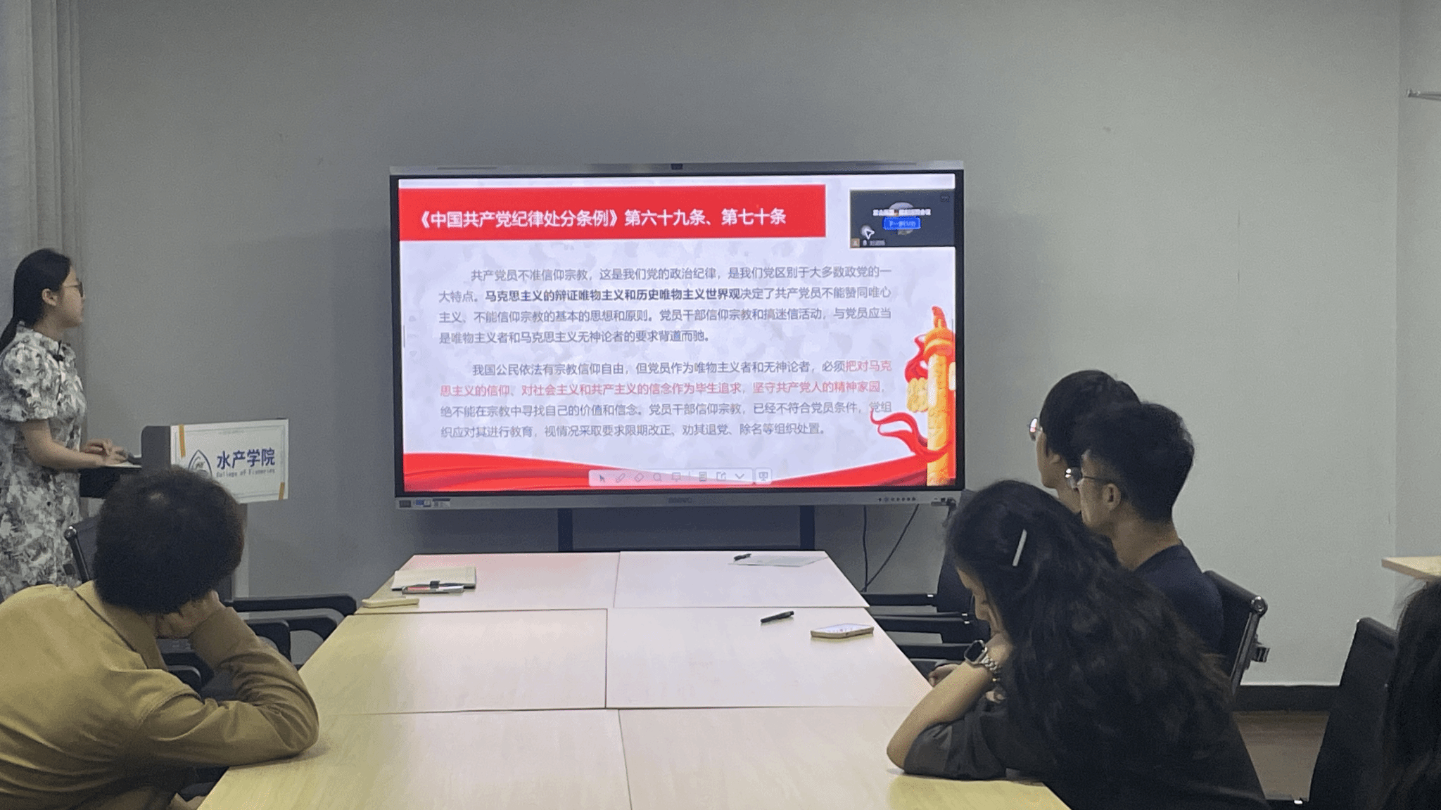 此外,由刘涵烁同志讲述党员不得信仰宗教的政治纪律。通过学习《中国共产党纪律处分条例》,党员们明确了共产党员作为无神论者的责任和义务,坚定了共产主义理想信念。