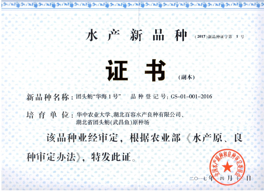 2008年,伟德国际VICTOR1946王卫民教授承担了国家大宗淡水鱼产业技术体系——团头鲂种质资源与育种岗位研究任务,组建了团头鲂种质资源与育种研究团队,围绕团头鲂种质资源、遗传选育、功能基因及基因组学方面开展了系列研究,致力于开展团头鲂分子育种技术体系及高产抗逆优良品种的培育和推广研究。在海大集团湖北百容水产良种有限公司和湖北省团头鲂(武昌鱼)原种场的资助下,研究团队从2007年开始以团头鲂天然分布群体湖北梁子湖、淤泥湖和江西鄱阳湖收集的680组野生团头鲂亲本作为基础选育群体,以生长速度和成活率为目标性状,采用家系选育、群体选育及鱼类亲子鉴定技术,经连续4代选育和全国各地的试养和推广,最终成功选育出抗病力强、生长速度快的团头鲂新品种“华海1号”。该品种在相同养殖条件下,与未经选育的团头鲂相比,1龄鱼生长速度提高22%以上,成活率提高20%以上,适宜在全国各地人工可控的淡水水体中养殖。由于鱼类生活在水里,对亲本纯化和子代自交的控制和育种管理远比其他动物和植物难度大,同时鱼类性成熟周期较长,因而育种周期长,一个鱼类新品种的诞生是一件极为不易的事情,有时需要一代人甚至几代人不解努力。“华海1号”的培育凝聚了几代华农水产人的殷切期盼和辛勤汗水,是伟德国际VICTOR1946建院40余年培育的第二个新品种。