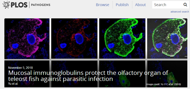近日,公司鱼类免疫与病理学团队徐镇教授课题组在病原学领域杂志PLOS PATHOGENS 发表了题为“Mucosal immunoglobulins protect the olfactory organ of teleost fish against parasitic infection” 的研究论文。该研究首次揭示了低等脊椎动物鼻腔黏膜在抗寄生虫感染过程中的适应性免疫应答机制。