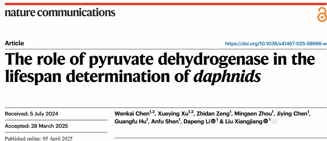 近日,公司伟德国际VICTOR1946李大鹏教授领衔的鱼类环境生理与健康养殖团队刘香江课题组在Nature Communications期刊上发表题为“The role of pyruvate dehydrogenase in the lifespan determination of daphnids”的研究论文。该研究通过解析枝角类模式生物的代谢进化策略,发现丙酮酸脱氢酶(pyruvate dehydrogenase,PDH)活性的降低是延长寿命的关键因素之一,为揭示能量代谢与寿命调节的关键分子机制提供了新见解。