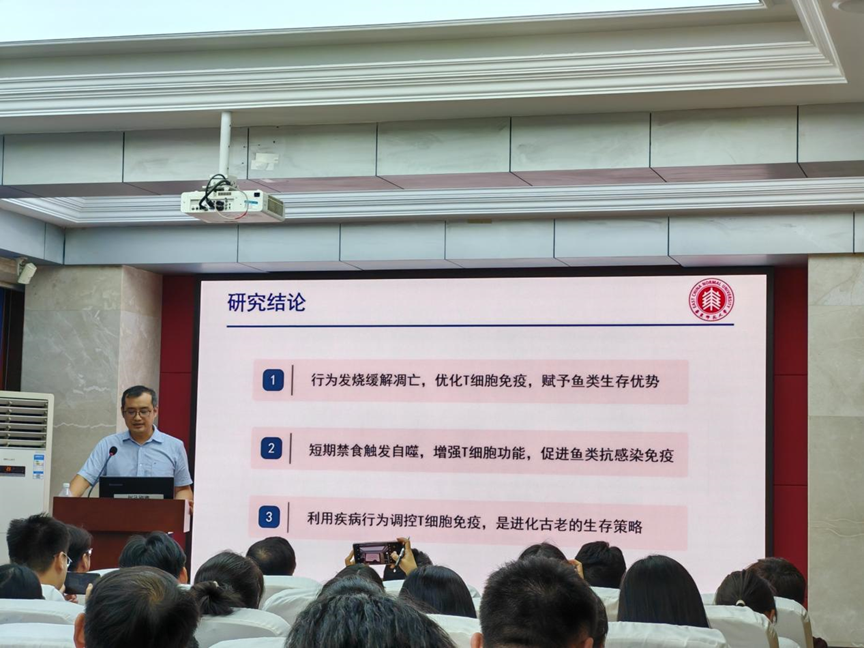 “疾病行为”指由于病原感染,通常伴随发烧、厌食、疼痛、乏力、嗜睡、情绪化等一系列行为,有研究表明,疾病行为是调控免疫反应的新途径,不仅恒温动物通过发烧优化其抗感染免疫,变温动物同样具有行为驱动的发烧,简称为“行为发烧”。杨教授发现,罗非鱼也可利用行为发烧抵御病原感染。进一步研究其深层原因,他指出,行为发烧通过增强T细胞功能、减少T细胞凋亡来实现免疫的,进一步研究其内在机制,杨嘉龙教授表示,发烧经HSP70-ERK轴,缓解T细胞凋亡、增强免疫。而鱼类可用行为发烧缓解T细胞凋亡,增强抗感染免疫。该研究的主要创新点表现为:发现了行为发烧优化冷血动物适应性免疫的新功能,并阐明机制;解析了发烧通过缓解T细胞凋亡,给予宿主生存优势的新途径;得出利用发烧增强T细胞免疫、细胞进化早期编程的新观点。